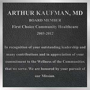 ![]() 12” X 12” Aluminum Plaque with black background and raised silver letters |