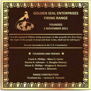 ![]() 22"x15" Etched bronze plaque with logo and gold letters. Black leatherette background and single line border |