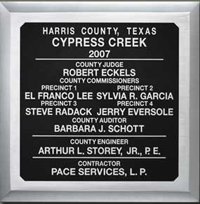 ![]() 16"X16" Cast Aluminum Plaque Single Line Wide Bevel Border - Stipple Texture Black background - raised silver letters & border |