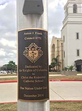 Mark: Thank you for your help with the curved plaque for the flag pole at the new Catholic School. Your expedient service allowed us to hold a dedication ceremony. Your constant support and communication through the entire process was much appreciated. Please see attached pictures. Best regards and thanks again, Briz |