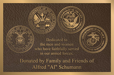 ![]() 8" x 12" Bronze cast plaque. Raised satin gold letters, single line border. Leatherette finish background with Military Emblems |