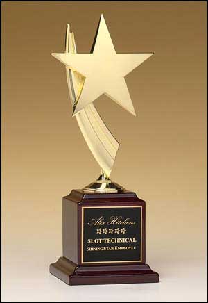 Polished metal goldtone star casting on rosewood stained piano finish base. ![]() AFA #109 Laser engravable plate(s). Solid brass engraving plate(s). |