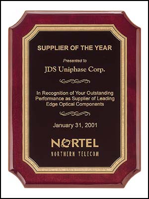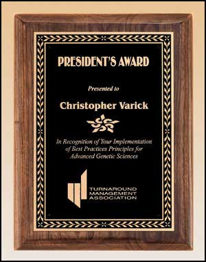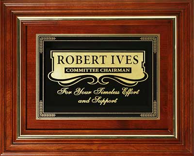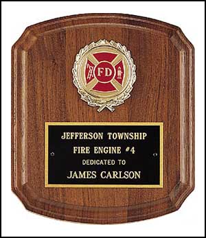 Rosewood stained piano finish plaque with notched corners, black textured center plate and florentine border. ![]() AFA #P3767 11" x 15" |