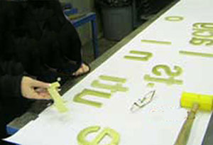 A worker is checking out the metal letters and looking over the mounting pattern for the letters so that the installation will be perfectly aligned. |