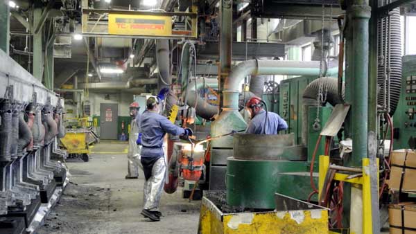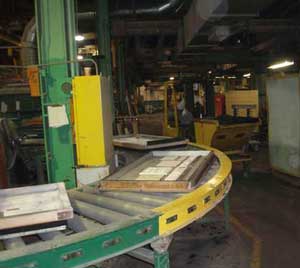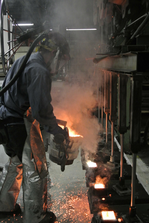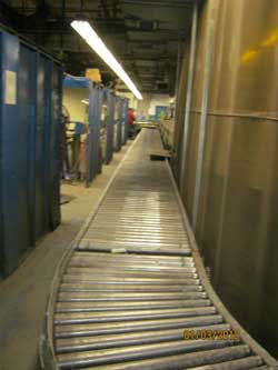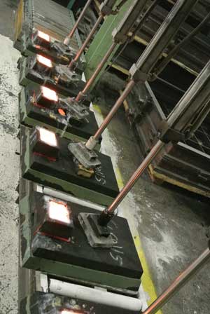 ![]() This sand cast has just been poured with molten bronze and needs to cool as it moves down the conveyor belt. |