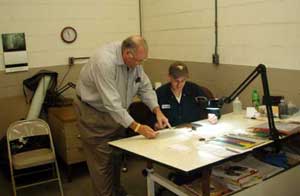 ![]() Jim is going over the details of exactly how and where the holes have to be drilled in the letters; again he is told to go back to the sales office. |