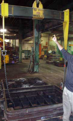 ![]() For larger plaques up to 8 feet in diameter, weighing several hundred to a thousand pounds, a crane is used to move the plaque around the foundry floor. |